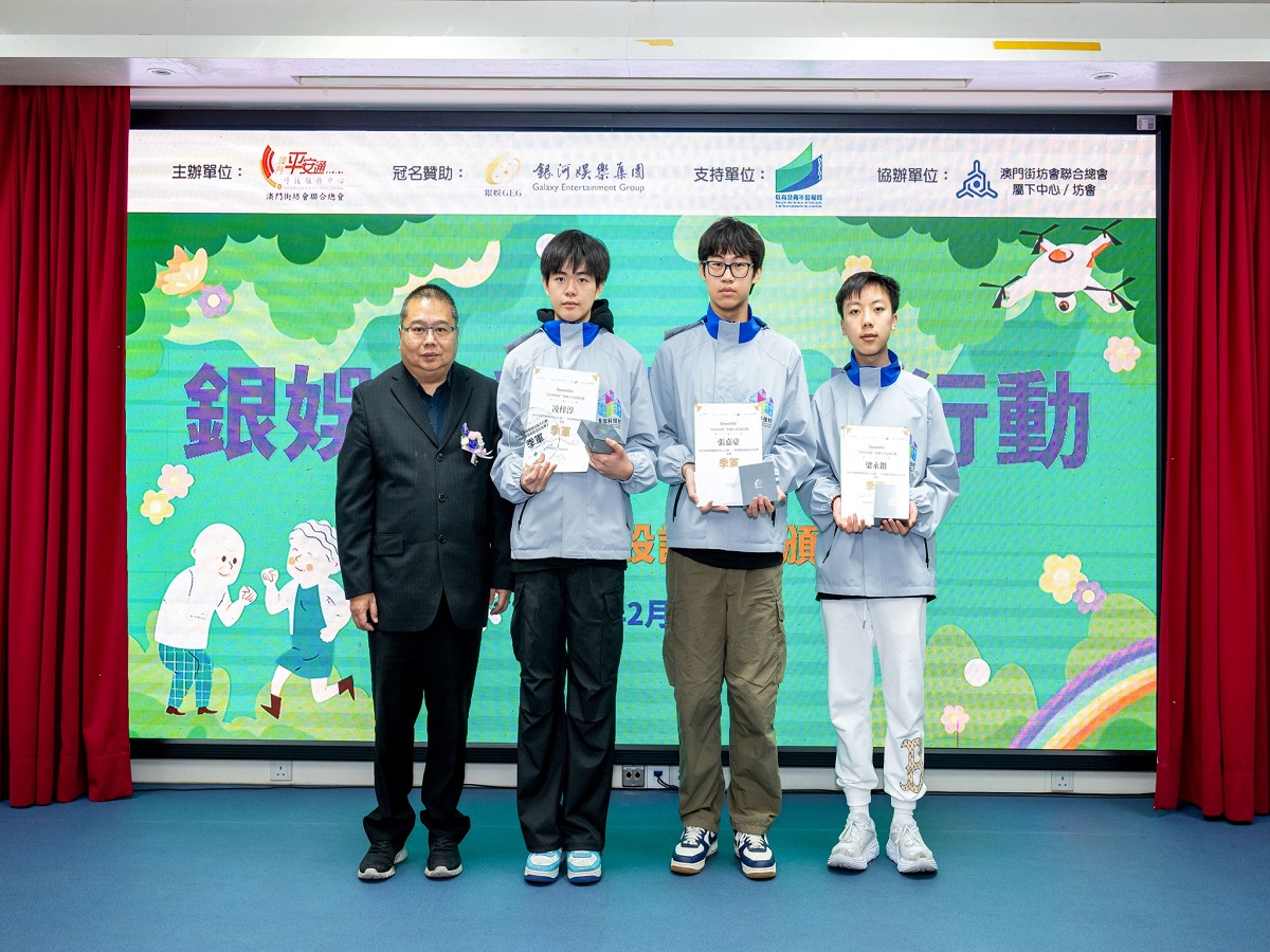日前,銀娛代表出席頒獎典禮並揭曉比賽結果,冠、亞、季軍分別由嘉諾撒聖心中學(中文部)、化地瑪聖母女子學校以及「青年科技村」科創人才培養計劃的隊伍獲得,我們在此再次恭賀獲勝隊伍 !銀娛期望藉此活動鼓勵青年善用科技力量,加強對社區及長者的關懷,推動構建長幼共融社會。
